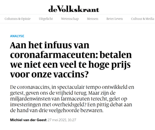 De farmaceutische bedrijven bestaan al enige tijd en ik heb niet begrepen dat er in de voorliggende jaren zo weinig werd verdiend vanwege de investeringen, dat de directie met een VW Golf naar het werk is gereden. Ik begrijp ook dat het bouwen van nieuwe installaties veel te veel tijd in beslag neemt, de door de farma-bedrijven aangevoerde reden om zeker geen vaccins elders te laten maken.